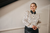 Dots, dots,dots! We absolutely adore the cute, classic design. The Modern Romance theme is all about the classics we all love; from delicate lace to the well-known polka dot. This black/off- pattern is printed on a pretty shimmering jacquard fabric in off-white, adding to the luxurious feeling. The must-have midi dress is finished with an adornment of black, floral lace near the neckline, whereas you find the black lace for the blouse on its collar.